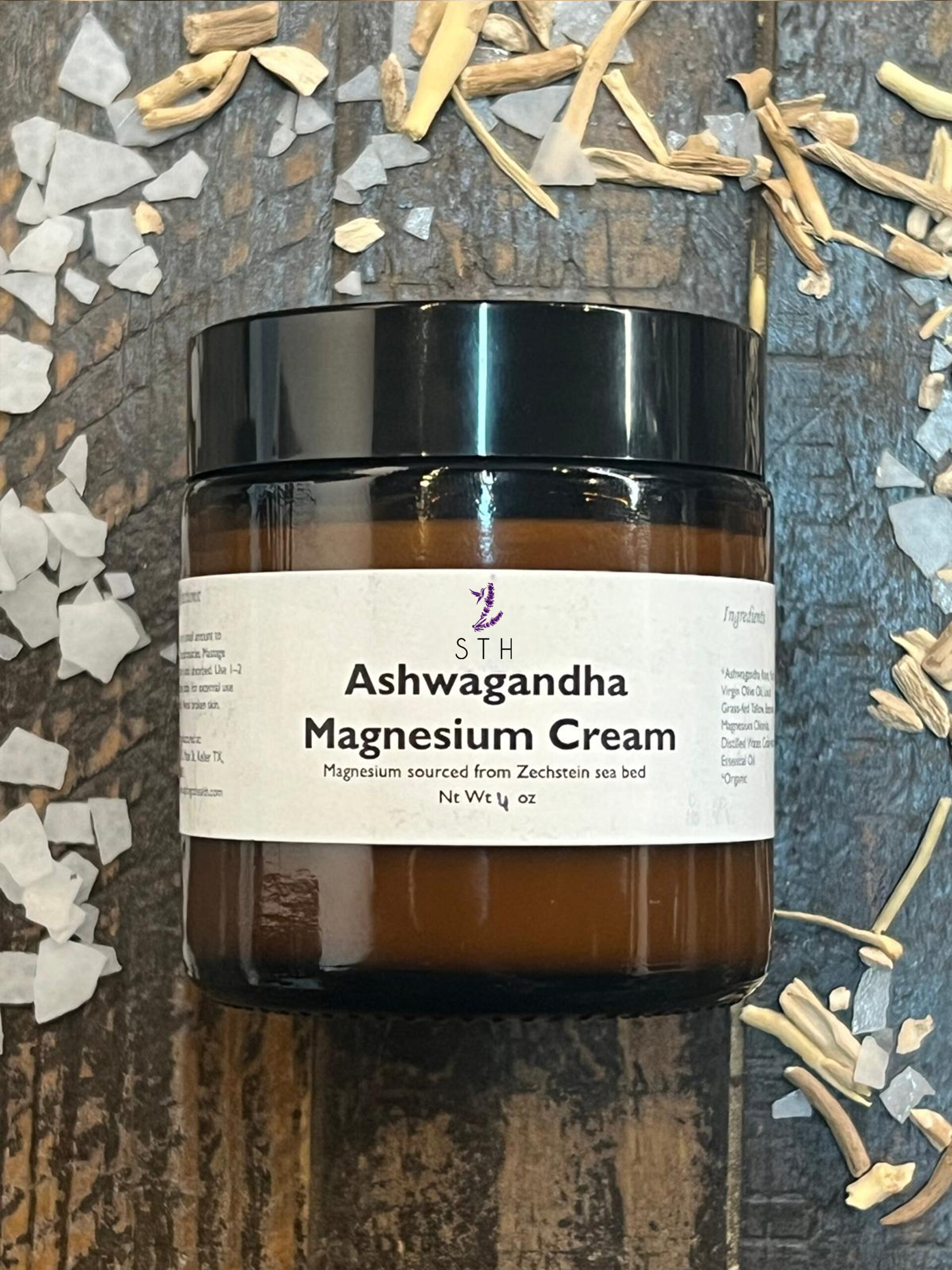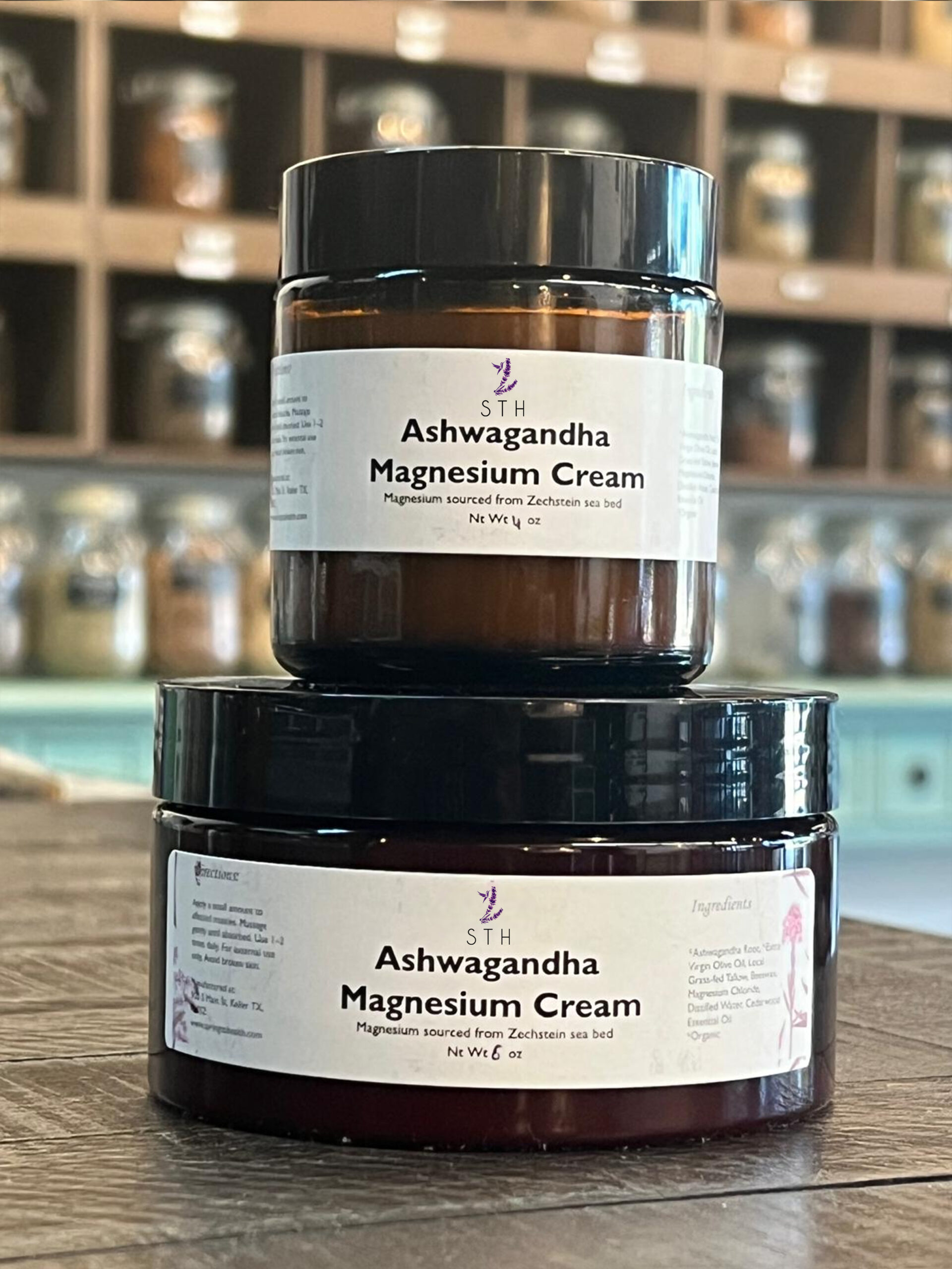 Melt away tension with Ashwagandha Magnesium Cream, a soothing botanical body cream crafted to comfort sore, overworked muscles and gently relax the nervous system. This non-toxic, handmade, preservative-free formula pairs muscle-supportive magnesium with adaptogenic ashwagandha, creating a calming ritual for the end of a long day, after movement, or anytime your body feels tight and fatigued.